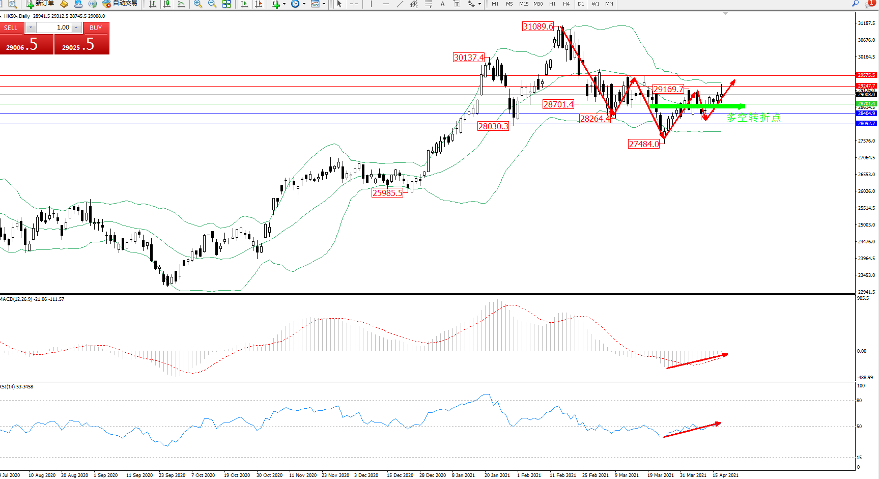 香港恒生指数4月19日(周一)收盘上涨136.44点,涨幅0.47%,报29106.15点;港股主要指数低开高走,三大指数均收涨。恒生科技指数涨1.39%报8346点。市场情绪明显回暖,但大市成交额并未有效放大,全天仅成交1501亿港元,南下资金净流入62.71亿港元。加密货币集体暴跌,区块链股全日低迷,大型科技股涨跌不一,小米升超2%,网易涨1.2%,阿里巴巴跌1.5%,腾讯、京东均下跌。南下资金今日净买入港股53.13亿港元,其中,沪市港股通净买入24.25亿港元,深市港股通净买入26.88亿港元。腾讯控股、小米集团-W、中国移动净买入额位列前三,分别获净买入12.73亿港元、9.81亿港元、6.49亿港元。净卖出前三个股为赣锋锂业、长城汽车、呷哺呷哺,分别遭净卖出6.89亿港元、1.65亿港元、1亿港元。香港特区政府统计处公布,今年首两个月,香港的商品整体出口货量及进口货量分别按年上升37.5%及27.2%。由于受到农历新年假期在不同日子所影响,每年1月及2月份的贸易数字通常有较大波动。香港新冠疫情再现变数,出现首宗感染变种新冠病毒的社区感染病例,境外输入病例持续高企。4月18日深夜,港府宣布对来自印度、巴基斯坦及菲律宾的航班实施“熔断机制”,从19日起,禁止所有来自这些地区的民航客机落地香港,为期十四天。