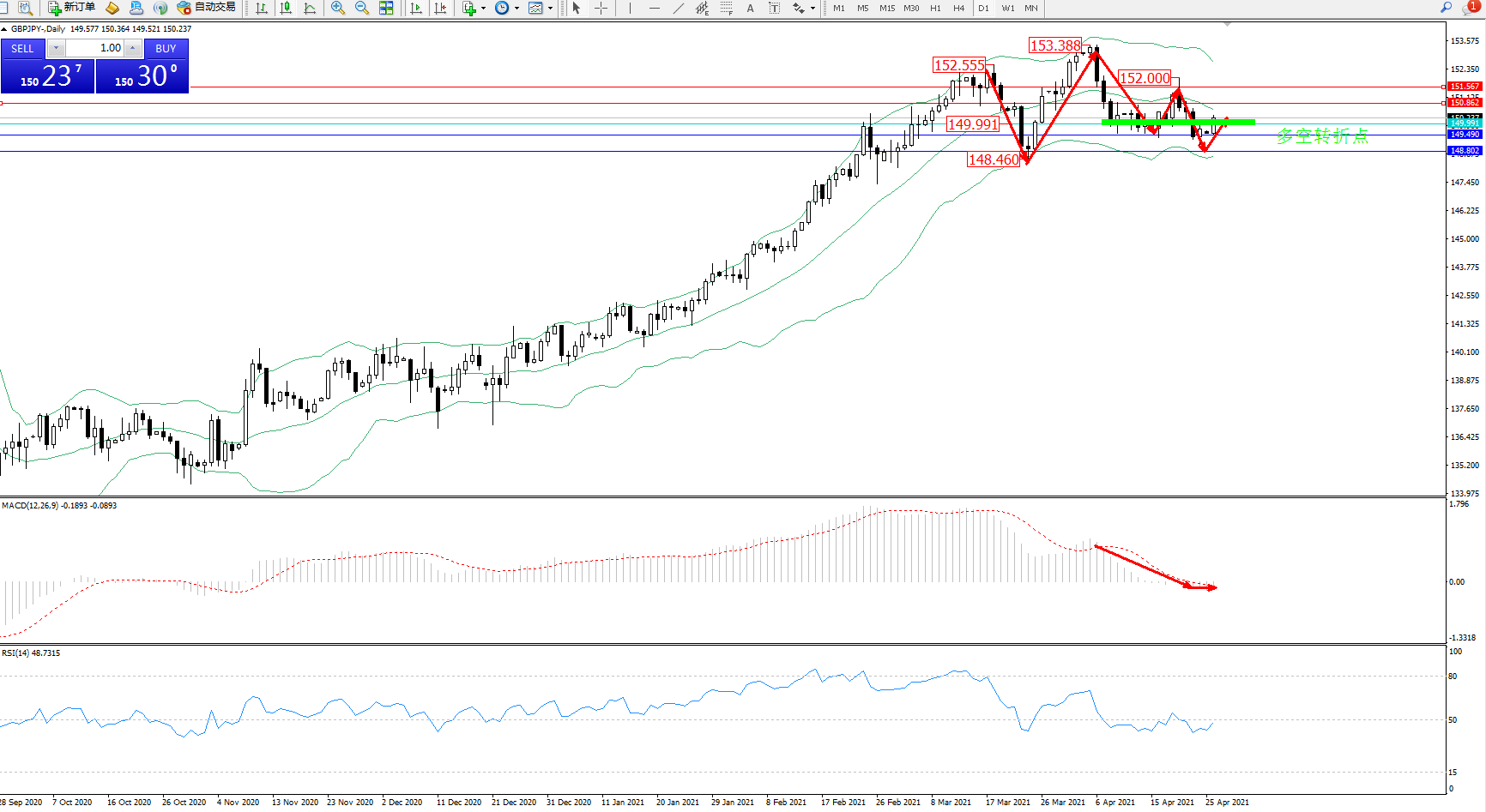 技术点评:多头动力延续布林带指标通道持续震荡上扬,高位触及153.388位置后震荡回撤下行,纠结于中下轨区间弱势整理平移,多头动力有伺上移迹象,触及中轨附近节点后再度震荡下行,短期或继续维持在中下轨区间持续震荡整理中,布林带指标呈下行震荡走势良好,MACD指标高位空头动力震荡下行至0轴线附近节点开始徘徊,RSI指标纠结于50均衡线下方弱势整理;