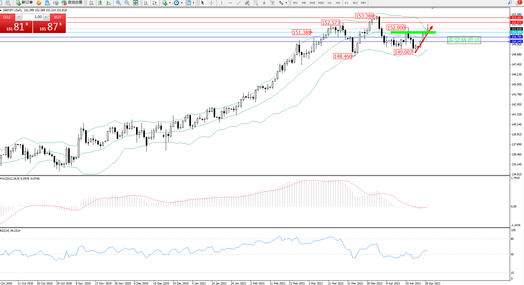 交易策略:151.388上方看涨,目标152.573、153.165