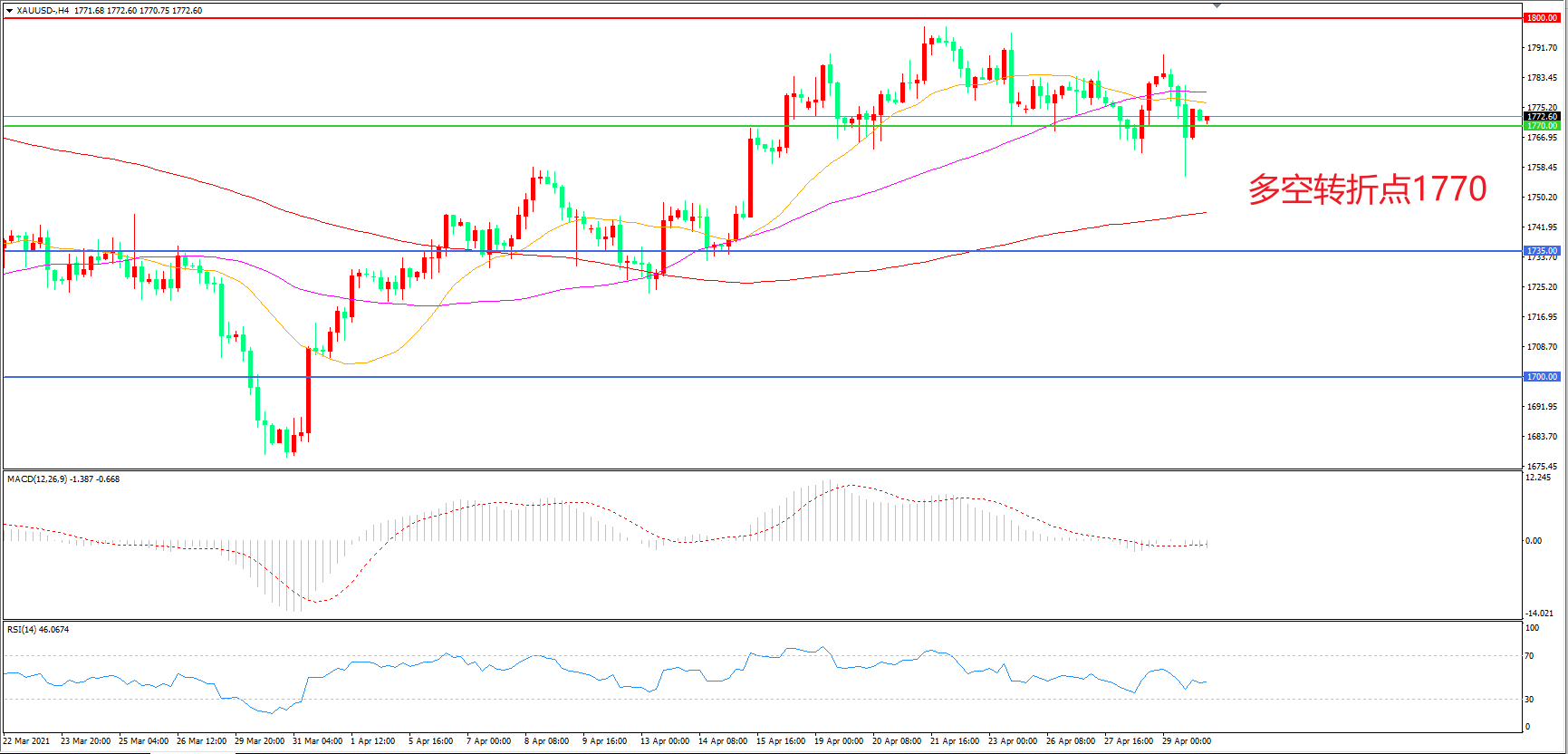 周四(4月29日),美国公布第一季度实际GDP年化季率初值,数据录得6.4%,远超前值的4.5%,也高于预期值的6.1%,良好的数据表现提振了美元的前景,对金价形成打压, 数据出炉后,COMEX黄金合约一分钟内交易合约总价值5.84亿美元,现货黄金延续高位震荡,收报1771.33美元/盎司。