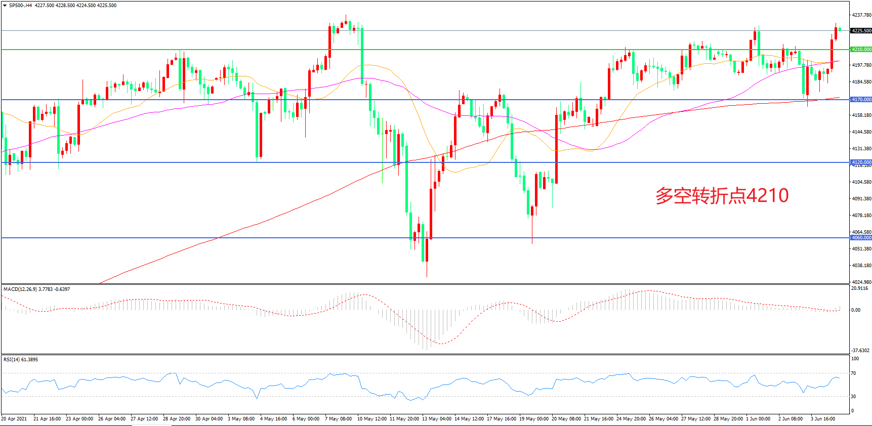 4小时图看,标普500大幅拉升,强势突破前期整理区间,4210成为短期多空分水岭,均线系统粘合成为短期,MACD红柱增加,RSI指标走平,日内震荡上行概率较大。