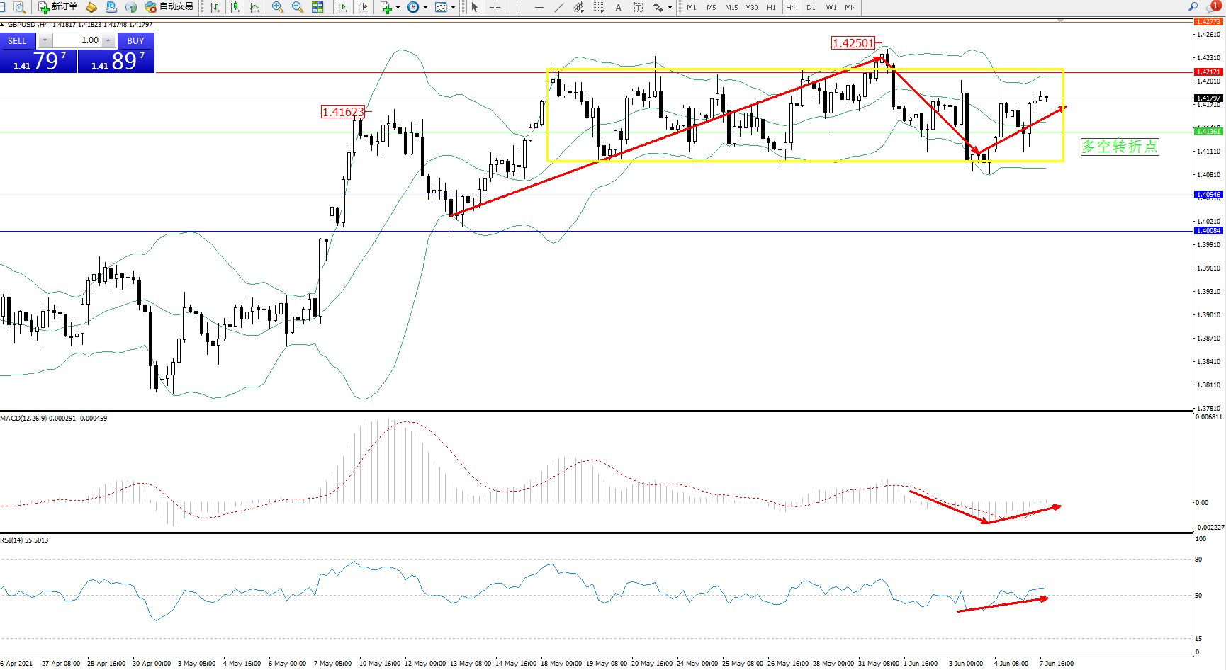 交易策略:1.41361上方看涨,目标1.42121、1.42773