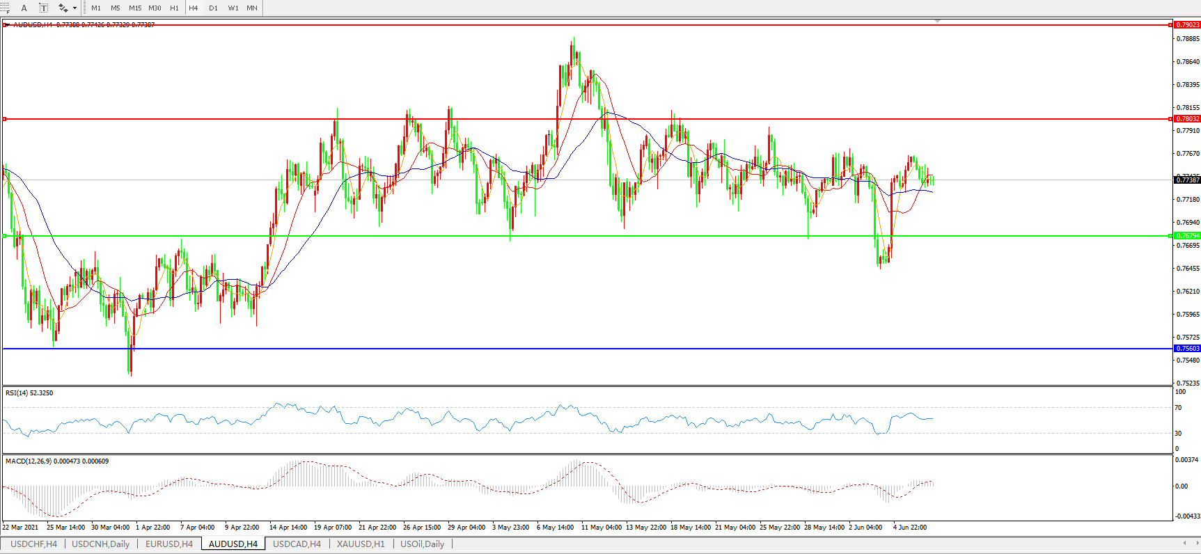 备选策略:0.7680下方看跌,目标0.7560、0.7400