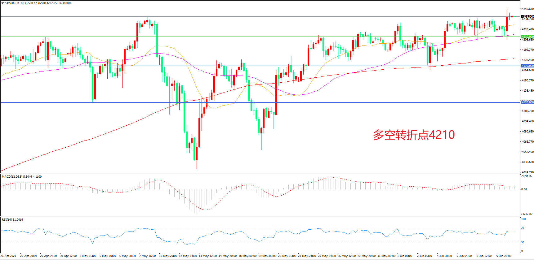 周四(6月10日),美国5月CPI超预期增长5%,创2008年8月以来最快同比增速,引发市场对通胀的担忧,10年期美债收益率闻讯跃升,一度重上1.53%刷新日高,标普500高开后长阳拉升,收报4238.25点。现在投资者争论的问题是,这些因素是否会像美联储预期的那样只会对通胀产生暂时的影响,美联储即将于下周开始举行为期两天的货币政策会议,他们对未来经济的看法将直接决定美股运行的方向。