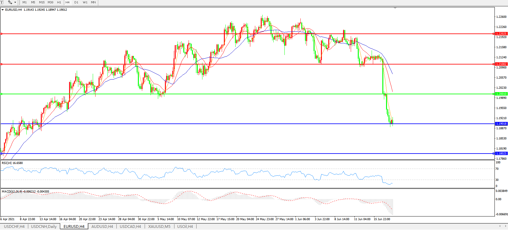 技术面简析:4小时图均线发散下行,汇价持续重挫,MACD下穿0轴且量能快速放量,RSI跳水,预计短期汇价大概率将进一步下行。