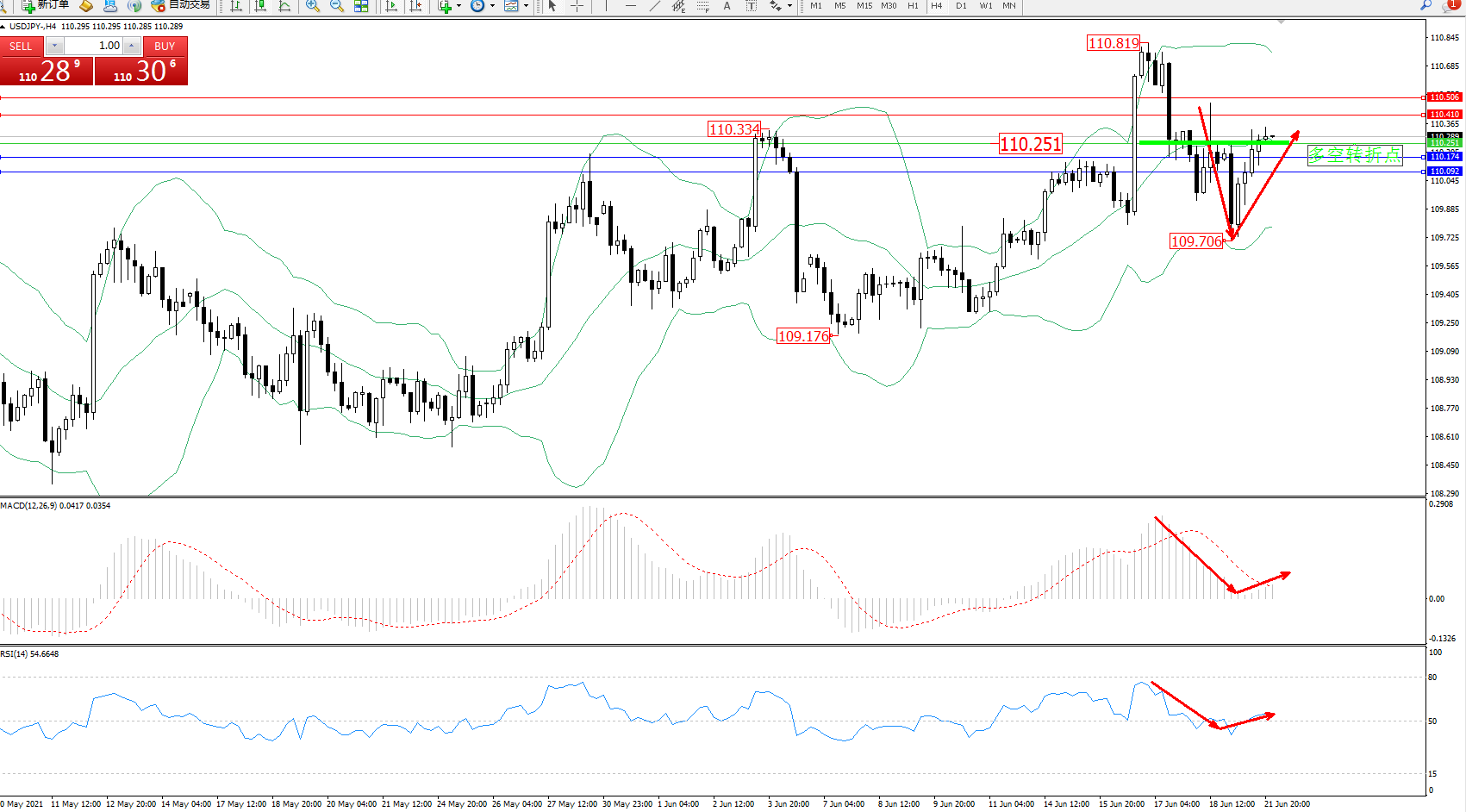 技术点评:高位空头动力持续震荡下行至布林带指标下轨附近节点,抵达109706位置后得到支撑反转上扬,触及中轨附近节点后有继续反转向上移动态势,布林带指标呈收口平移走势持续中,关注中轨附近节点,MACD指标处于多头区域高位震荡回撤后弱势整理徘徊向上移动中,RSI指标处于50均衡线上方弱势徘徊中;