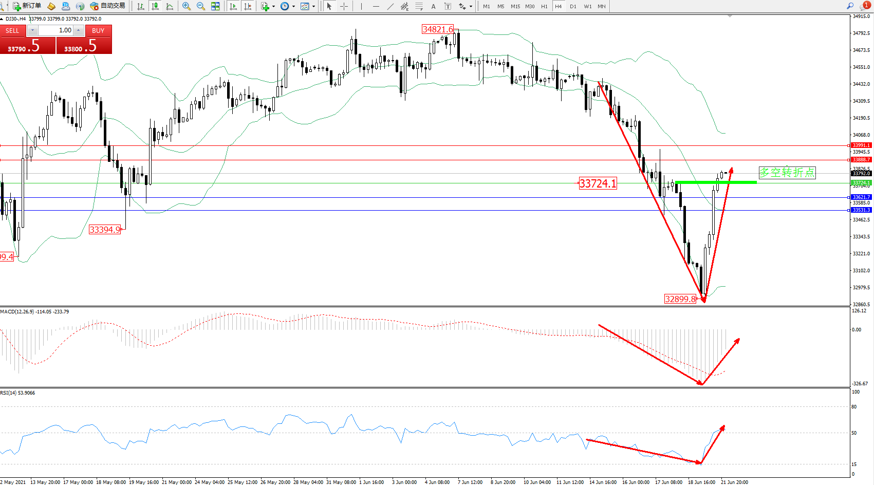 技术点评:空头动力延续布林带指标下轨附近节点持续下探,低位抵达32899位置后得到支撑反转上扬,突破中轨进入中上轨区间持续震荡向上拉升,布林带指标呈张口走势后开始有收口迹象,MACD指标处于0轴线下方空头区域维持震荡缓慢上扬,RSI指标处于空头区域低位震荡急速回升至50均衡线上側维持震荡中;