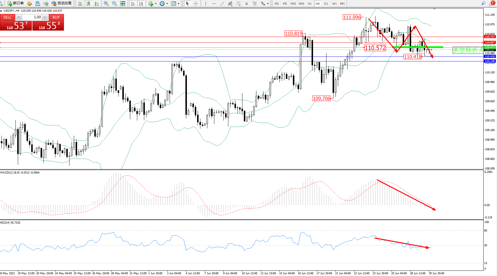 技术点评:高位空头力度呈阶梯式震荡持续下行,抵达110.418位置后开始整理平移,处于布林带指标呈通道内持续震荡向下移动中,布林带指标呈收口走势平移后开始反转向下移动中,MACD指标空头动力持续下行至0轴线下方弱势向下移动中,RSI指标处于50均衡线下方窄幅整理平移中;