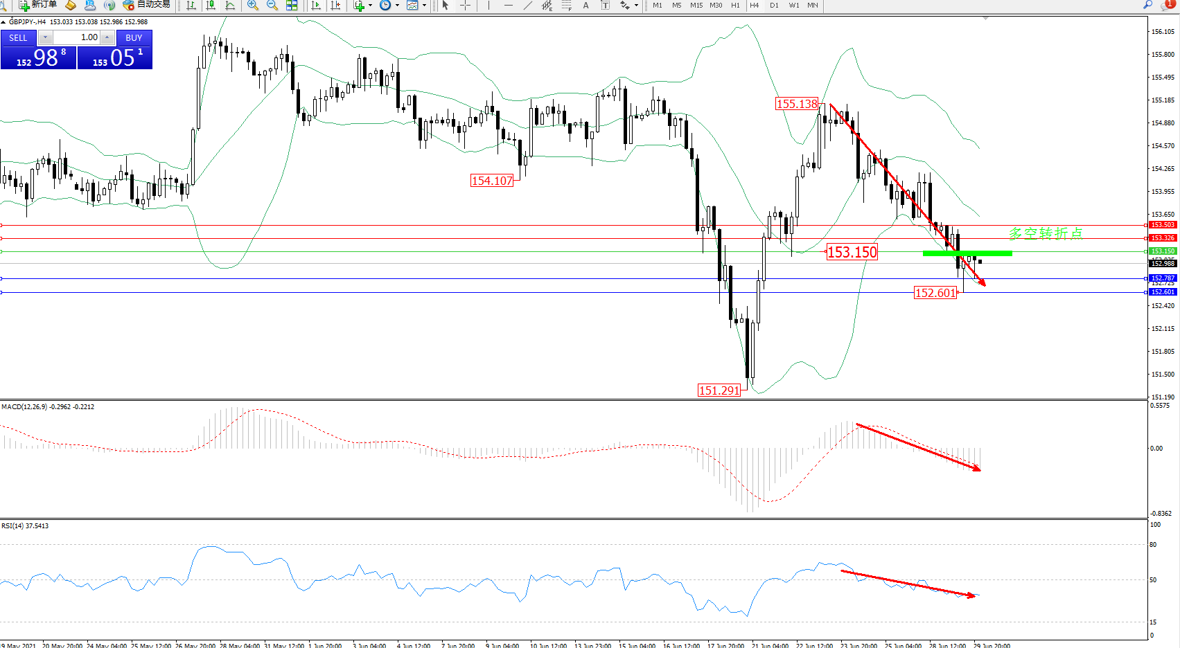 交易策略:153.150下方看跌,目标152.787、152.601