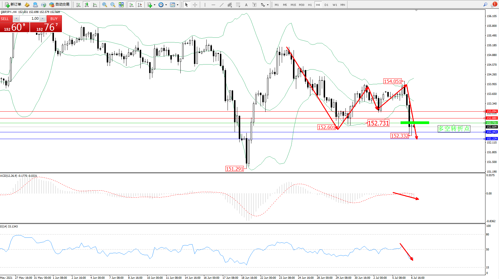 备选策略:152.731上方看涨,目标152.880、153.094