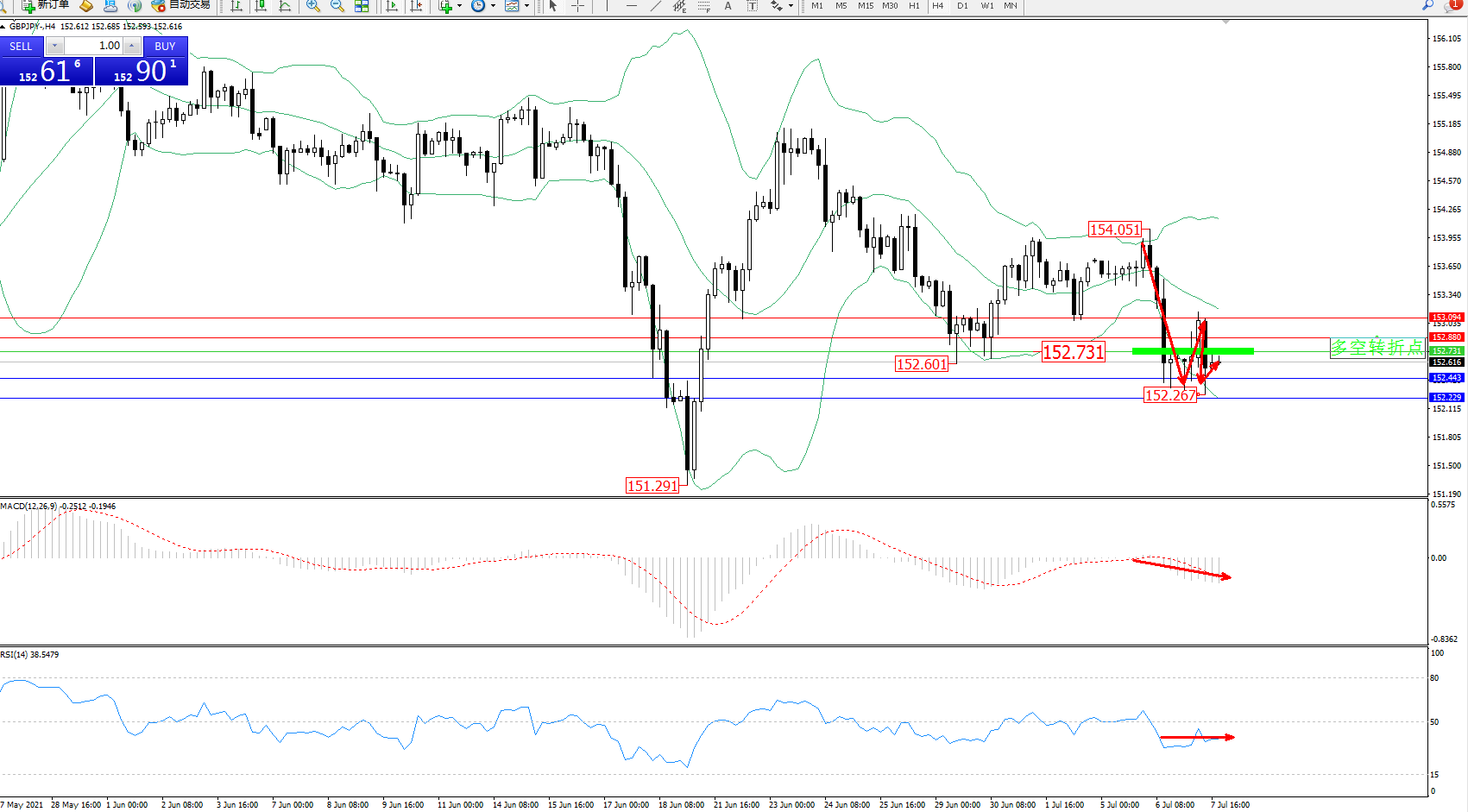 技术点评:空头动力延续布林带指标通道中下轨区间持续震荡下行,触及152.267位置得到短期支撑反转震荡回升,但空头动力依旧强劲,布林带指标呈张口走势持续中,短期或维持低位徘徊,MACD指标处于0轴线下方空头区域维持弱势整理中,RSI指标处于50均衡线下方窄幅徘徊整理;