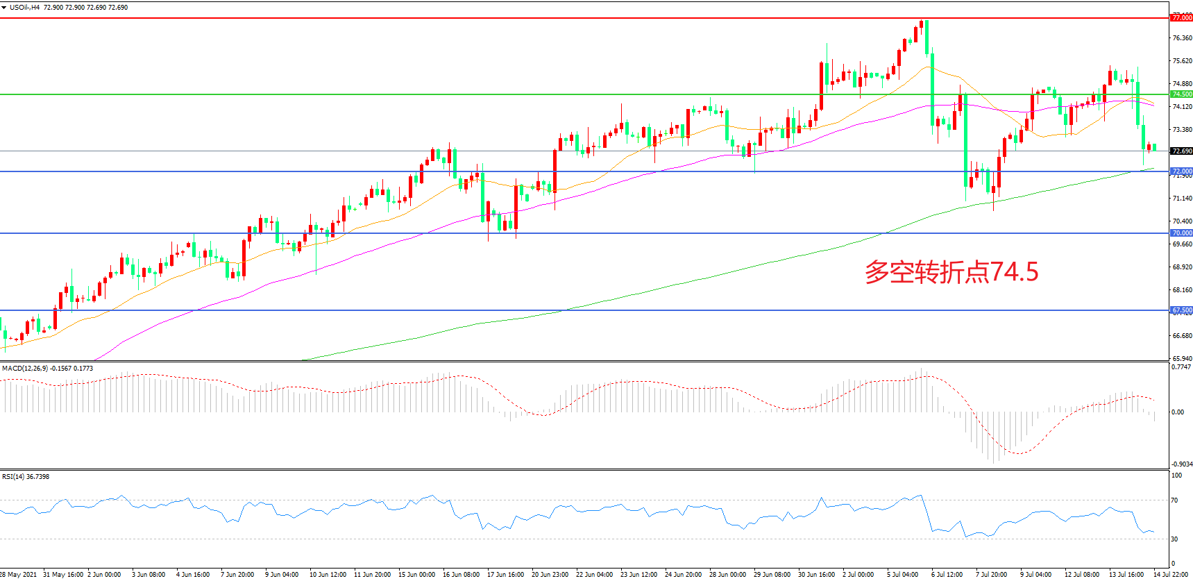 交易策略:在74.50之下看跌,目标72.00 70.00