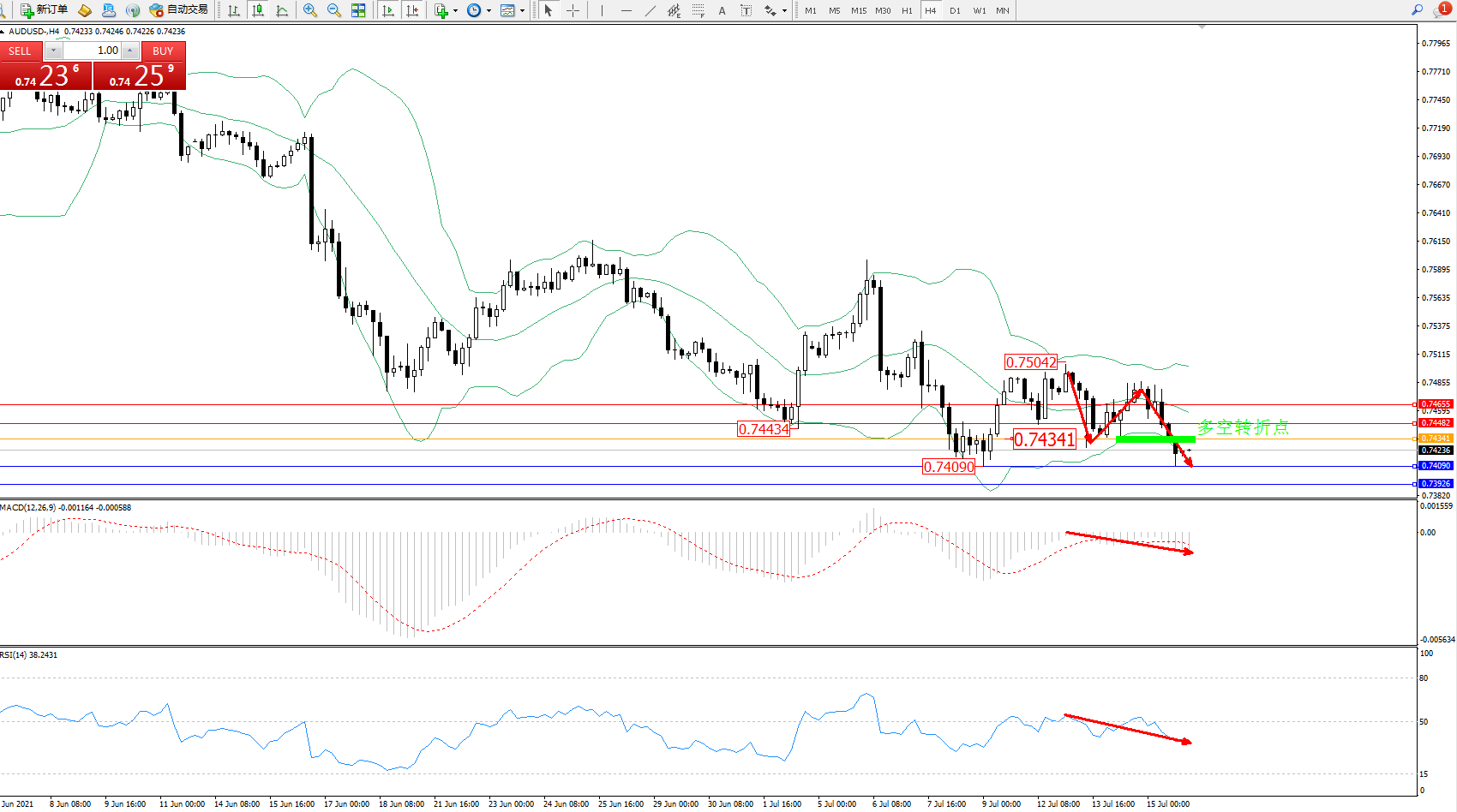 交易策略:0.74341下方看跌,目标0.74090、0.73926