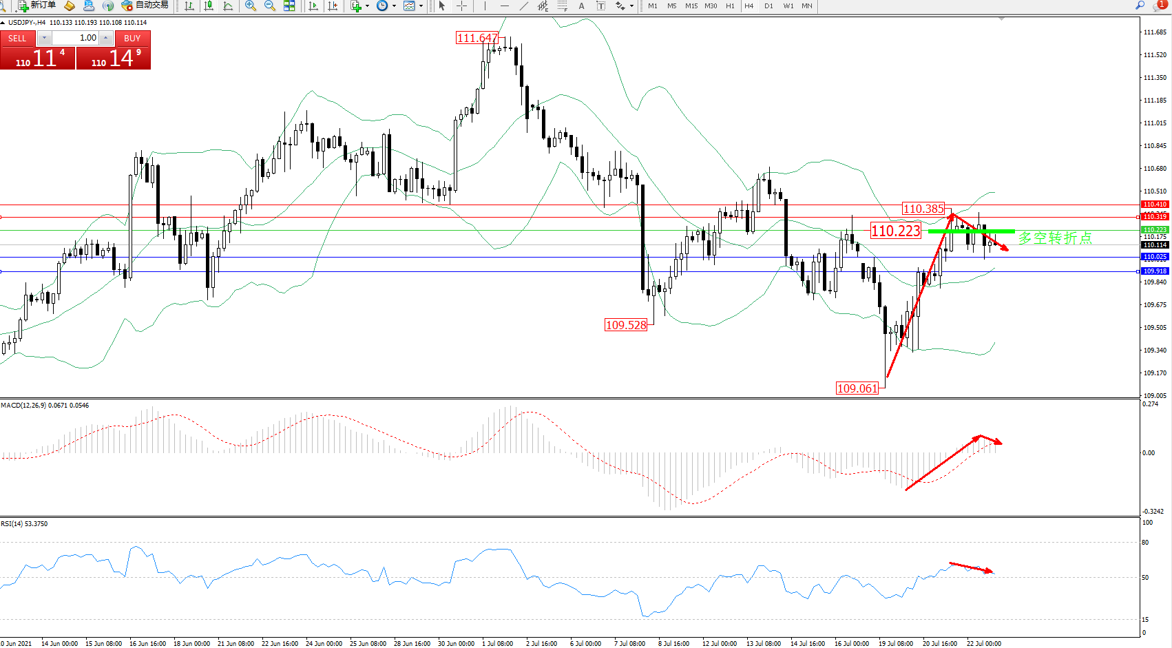 技术点评:低位多头动力强势震荡上扬,高位抵达布林带指标上轨110.385位置后遇阻,开始短暂整理缓慢回撤,布林带指标呈张口走势后开始收口向上移动,MACD指标处于0轴线上方多头区域维持整理,RSI指标处于50均衡线上方弱势徘徊中;