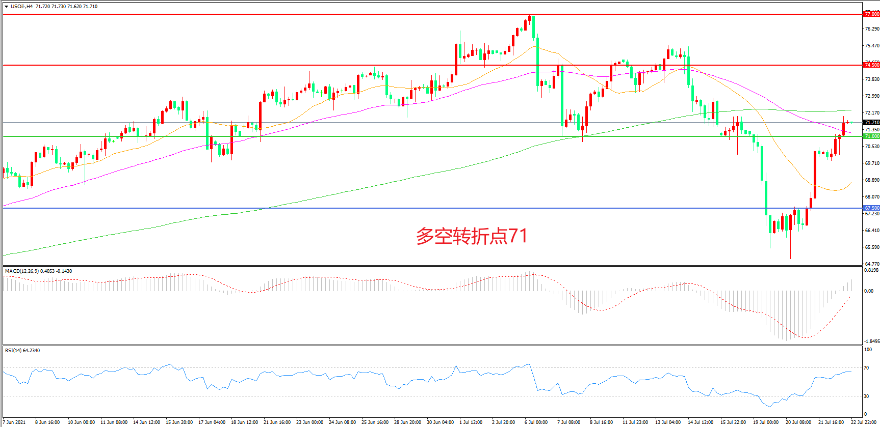 周四(7月22日),尽管美国原油库存意外增加以及新冠变异毒株Delta感染病例增加威胁需求,但市场预期供应将一直紧张到年底,美国WTI原油再度强势上行,收报71.72美元/桶。欧美油品需求虽然还在修复没有出现衰退,但在Delta变异毒株的影响下市场对于需求前景做了修正。技术指标上,油价经历了如此长时间的上行,仅仅通过几天就调整完毕,似乎有些过于着急。当前的原油基本面虽然强,但似乎还没有强到如此地步。因此,预计市场分歧仍将加大,原油将进入高波动性时代。