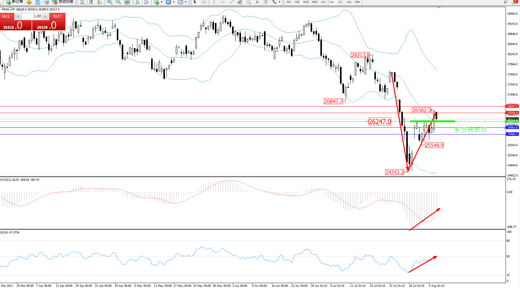 技术点评:低位多头动力呈V型反转上扬,触及布林带指标中轨附近节点破位后抵达26582位置遇阻整理,多头动力有进一步回升态势,布林带指标呈收口走势持续中,MACD指标处于空头区域低位震荡向上移动中,RSI指标处于空头区域持续震荡上移至50均衡线附近徘徊;