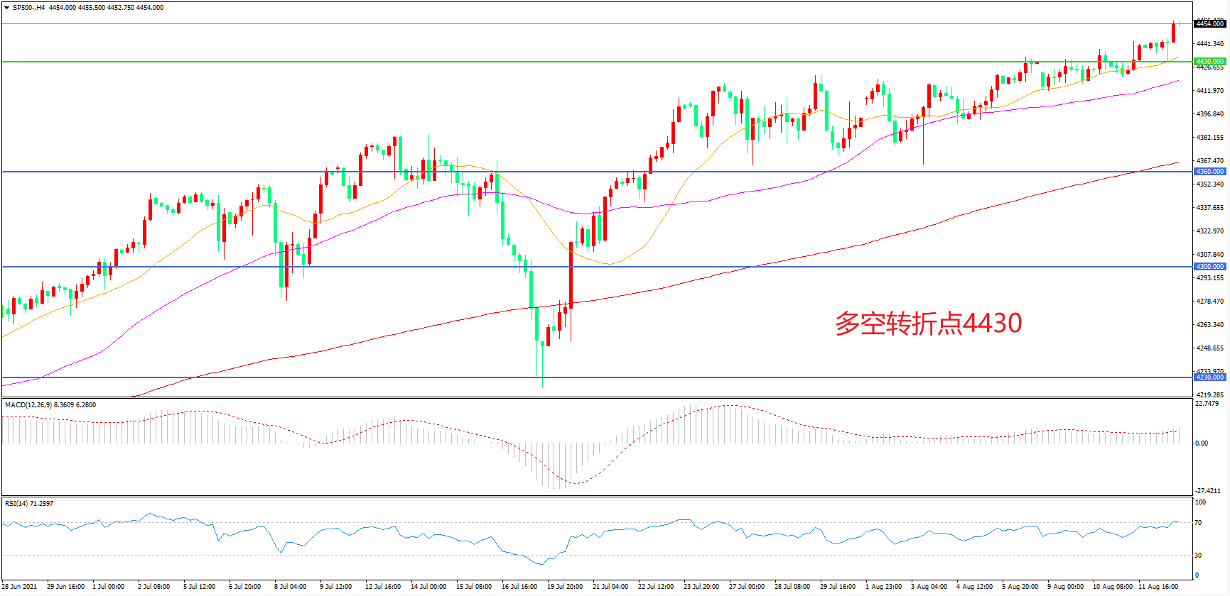4小时图看,标普500以均线系统为支撑震荡上行,短期表现偏强,21周期均线成为下方支撑,4430成为多空分水岭,MACD红柱增加,RSI指标走平,日内震荡上行概率较大。