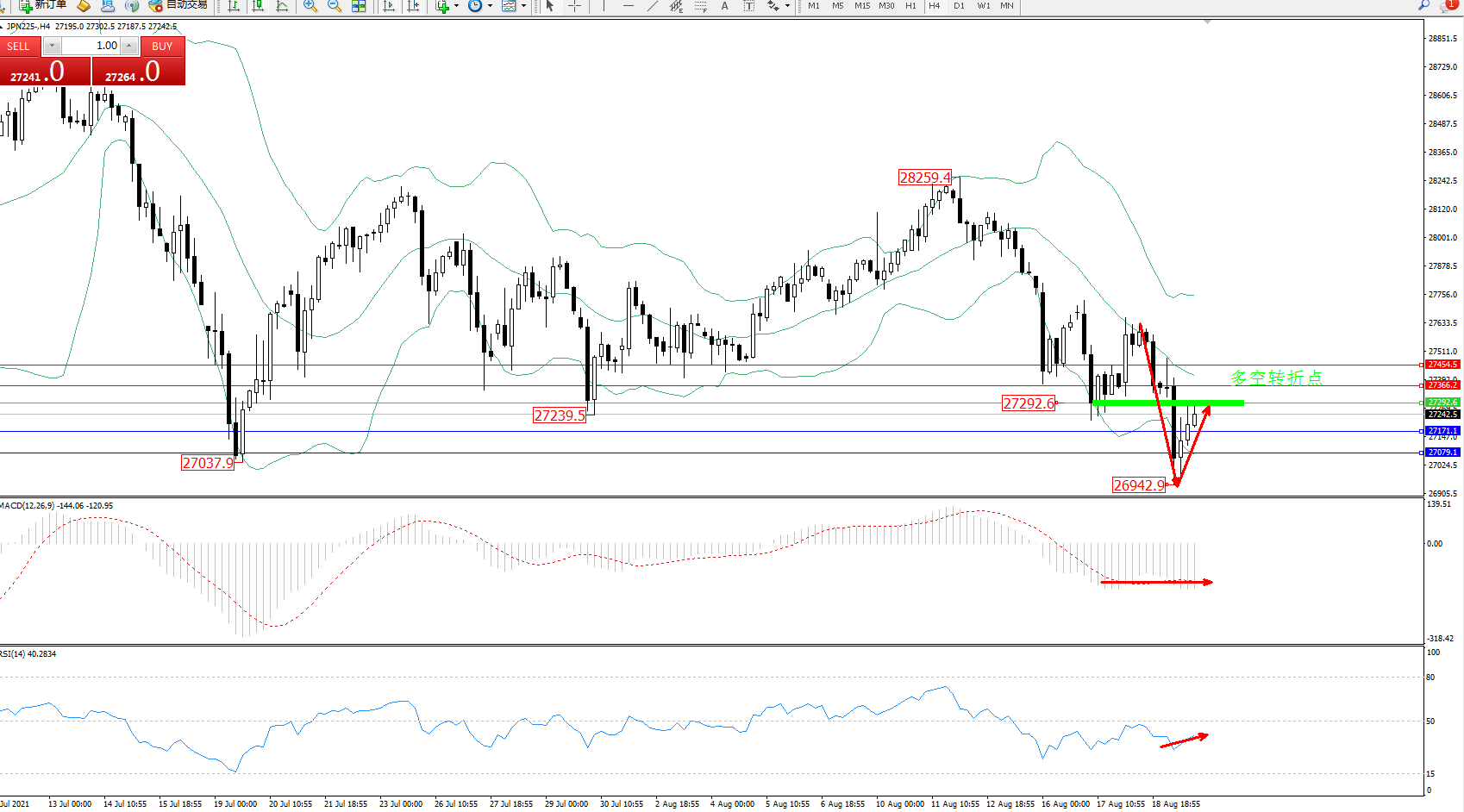 技术点评:空头动力延续布林带指标通道中下轨区间持续震荡下行,低位抵达26942位置后快速回升,但下行趋势态势良好, 短期尚未改变最终趋势走势,布林带指标呈缓慢张口走势中,MACD指标处于空头区域低位持续震荡平移,RSI指标处于空头区域持续震荡平移中;