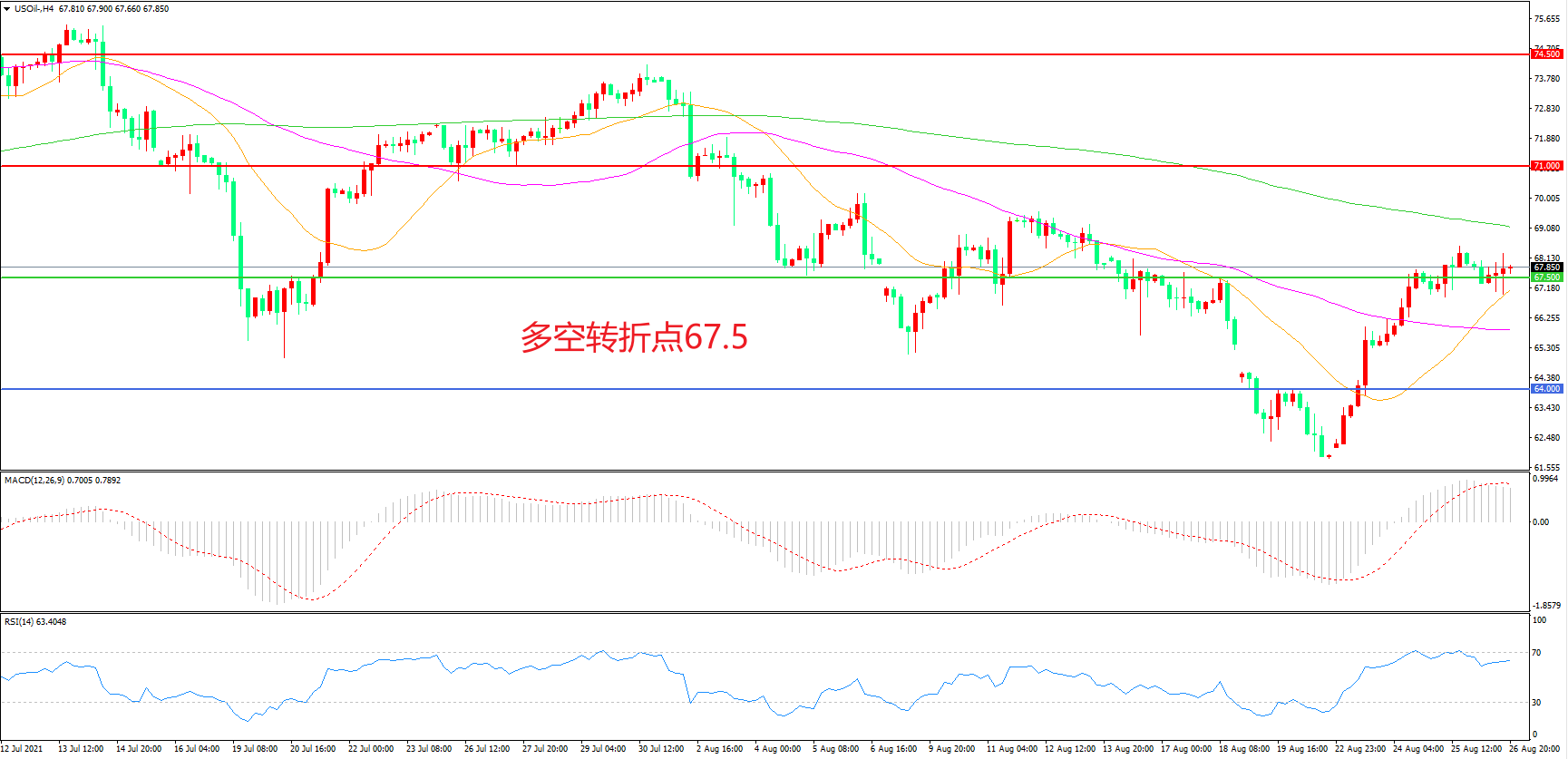 4小时图看,油价突破67.5美元后延续窄幅震荡,21周期均线成为下方支撑,200周期均线成为上方阻力,MACD红柱增加,RSI指标走平,日内延续震荡概率较大。