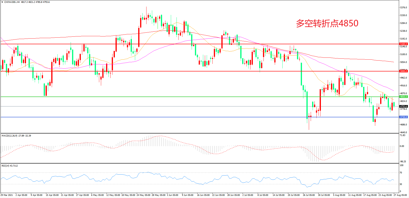 4小时图看,沪深300受到均线系统的压制连续下行,弱势震荡迹象明显,4850成为短期分水岭,MACD绿柱缩短,RSI指标走平,日内下行概率较大。
