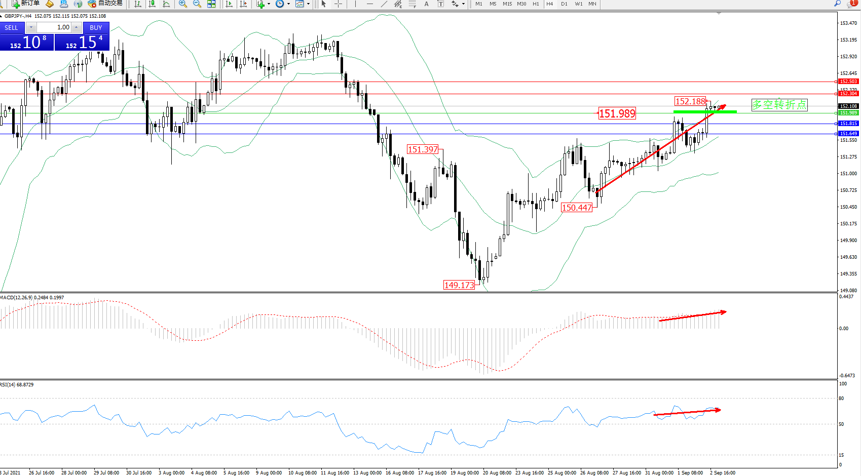 技术点评:多头动力延续布林带指标通道中上轨区间持续震荡向上移动,高位抵达152.188位置后有继续攀升态势,短期多头动力未见止步迹象,布林带指标呈上行趋势态势良好,MACD指标处于多头区域持续整理缓慢上移中,RSI指标处于多头区域维持震荡上行;