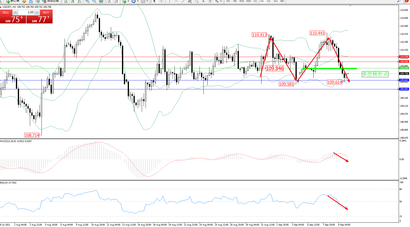 技术点评:长时间维持在布林带指标通道内宽幅震荡中,期间多次来回触及上下轨区间节点,呈喇叭形态走势逐渐扩大波幅空间,低位抵达109.614位置后开始短暂整理,MACD指标纠结于0轴线下方弱势徘徊,RSI指标护眼50均衡线下方空头区域持续震荡中;