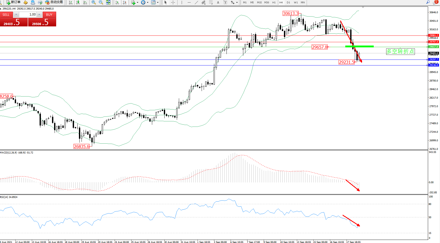技术点评:高位长时间维持在布林带指标通道内窄幅整理后,空头动力终究发力,延续布林带指标下轨附近持续震荡下探,低位抵达29231位置节点后开始震荡,短期或有进一步向下移动态势,布林带指标呈张口走势持续中,MACD指标处于空头区域持续震荡向下移动,RSI指标处于空头区域持续震荡下行走势中;