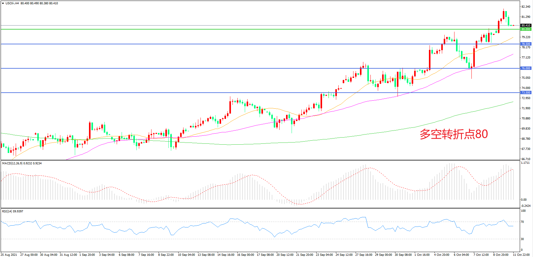 周一(10月11日),席卷全球的能源危机正在加大北半球越冬困境,,“商品之王”原油也在供应紧张和经济回暖的预期下大涨,美国WTI原油大幅飙升,时隔7年后首次突破80美元大关,最终收报80.46美元/桶。随着全球交通限制的缓解,运输燃料需求将进一步复苏,加上OPEC+限制生产政策,在市场明显转向之前,原油市场仍会保持强势状态。