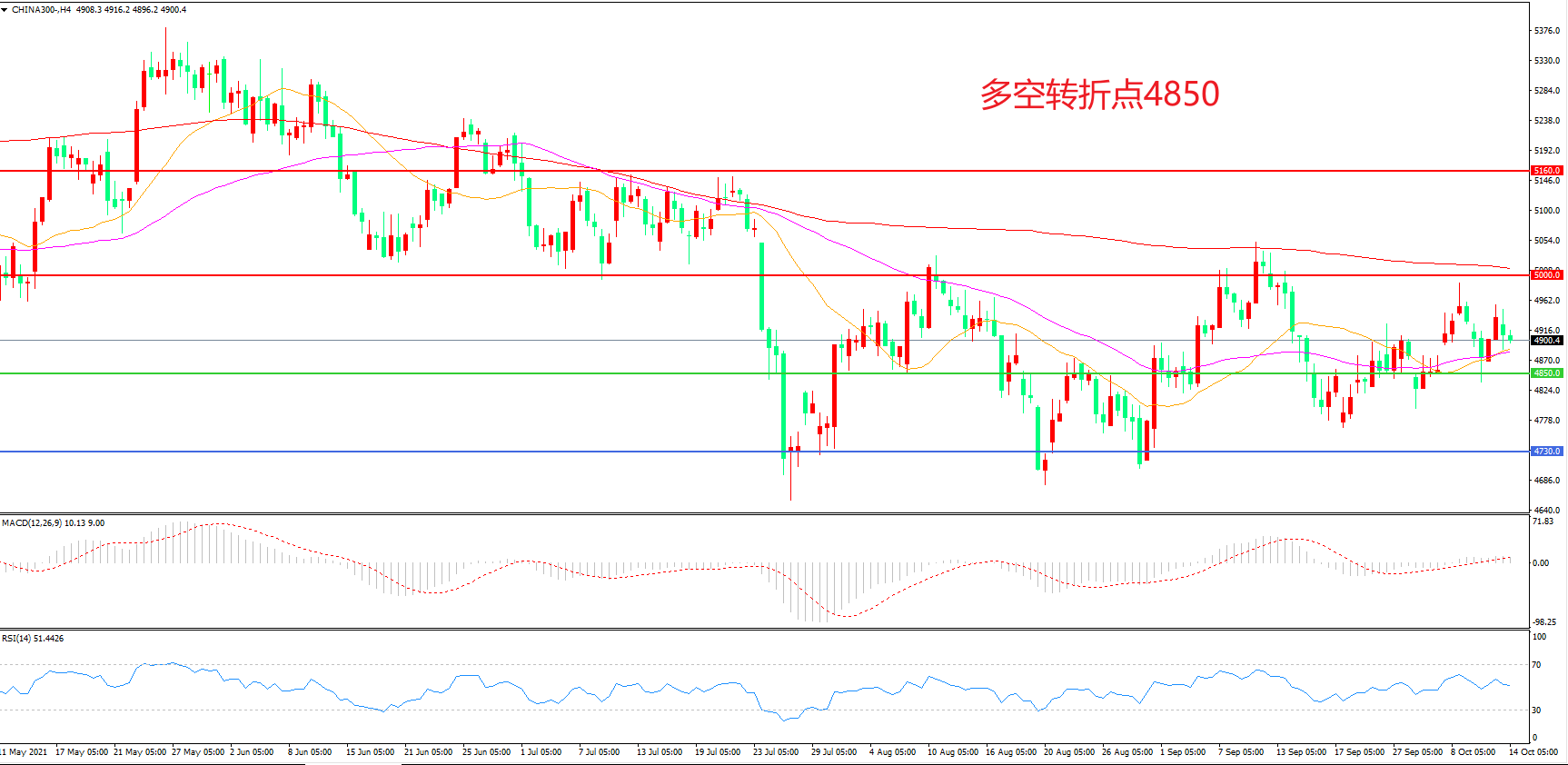 4小时图看,沪深300区间震荡迹象明显,4900成为下方支撑,5000点成为上方阻力,MACD红柱缩短,RIS指标走平,日内延续震荡概率较大。