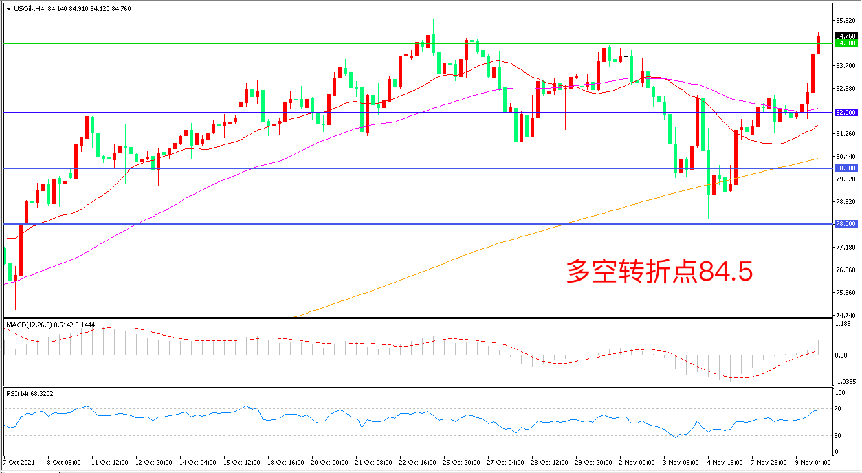 周三(11月10日)凌晨,美国白宫表示,今天不会宣布释放战略石油储备(SPR)的计划,将继续与OPCE合作提高石油供应,美国WTI原油开盘大涨,大幅上行后报84.68美元/桶。同时根据美国石油协会公布数据,API原油库存意外减少248.5万桶,如果晚间EIA库存出现大幅下降,油价将再次迎来飙升。