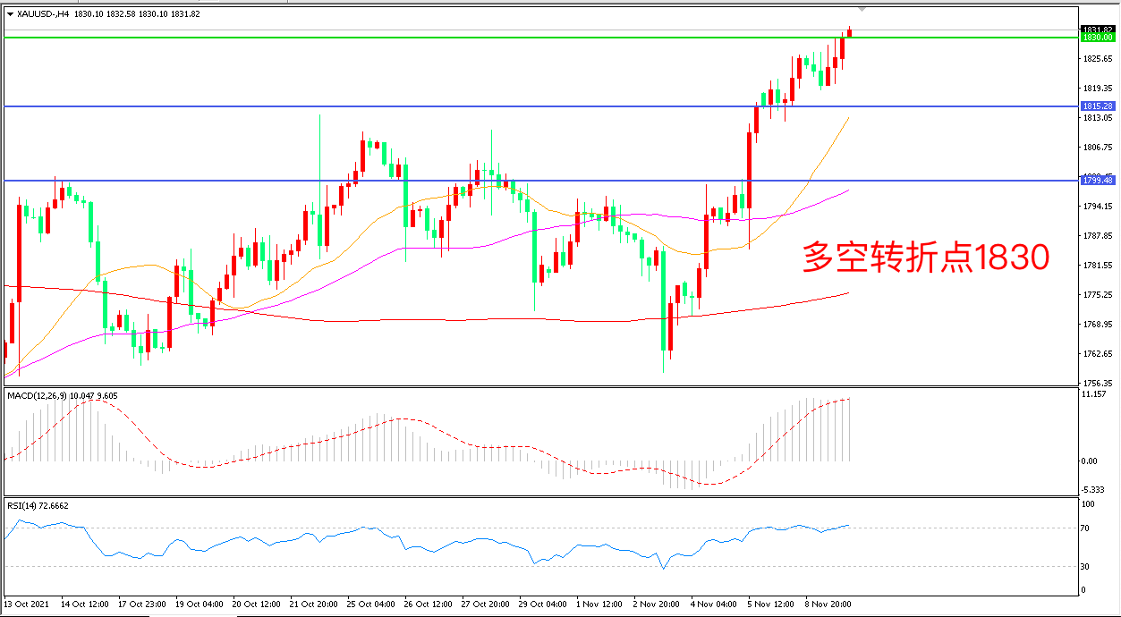 周二(11月9日),美国公布10月PPI月率录得0.60%,符合市场预期,10年期国债收益率略有下降,美元指数进一步承压,金价延续近期强势表现,收报1831.43美元/盎司。上周三美联储宣布缩减量化宽松后,黄金价格没有因此下跌,反而出现飙涨,说明市场空头动能已经衰竭,目前投资者在等待关键的美国通胀数据,如果通胀继续走高,金价将开启新一轮的上升。
