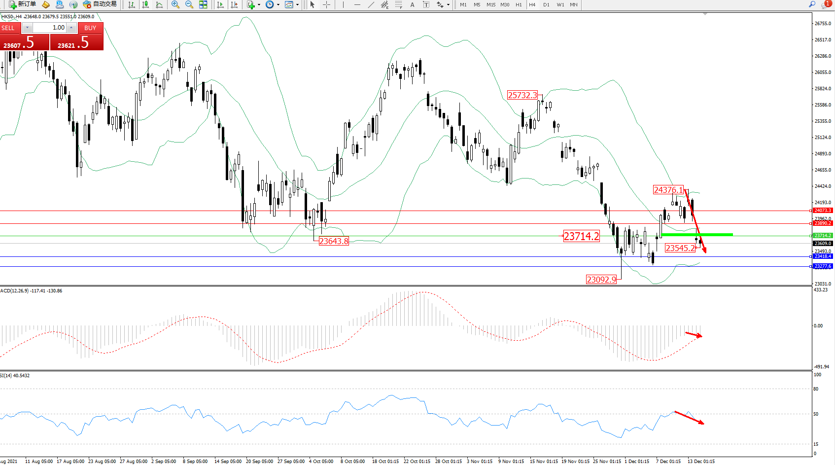 香港恒生指数12月14日(周二)收盘下跌318.63点,跌幅1.33%,报23635.95点;港股三大指数全天呈单边下跌行情,恒生科技指数跌2.28%。大型科技股普跌,小米跌超4%,百度跌超3%,腾讯、阿里巴巴皆有跌幅。A股数字货币板块集体走强的同时,港股区块链股集体飙升。火币科技放量收涨54.85%,欧科云链收涨21.68%,雄岸科技收涨14.58%,裕兴科技涨5.56%。大市成交额为1199亿港元,南下资金逆势净流入28.66亿港元。香港特区行政长官林郑月娥14日出席行政会议前表示,政务司司长李家超当日率领包括保安局局长、食物及卫生局局长和创新及科技局局长在内的政府团队前往深圳,准备与广东省的代表召开对接会议,商讨通关安排。林郑月娥表示,此次通关涉及重开陆路口岸,因此要与广东省、内地海关、内地相关市政府及相关部门商讨细节。有关会议有利于保安局评估陆路口岸的承载力,以决定如何重启口岸。