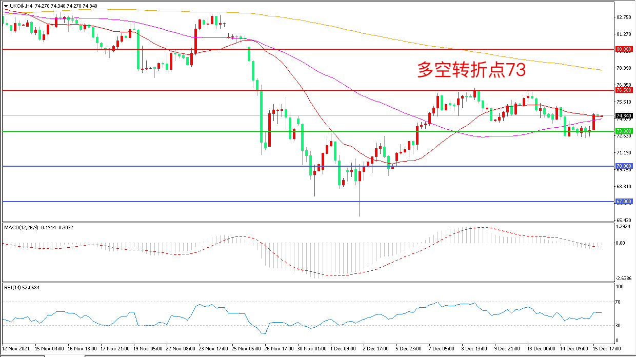 4小时图看,油价延续高位调整,区间震荡继续明显,73美元成为多空分水岭, MACD绿柱增加,RSI指标走平,日内延续震荡概率较大。