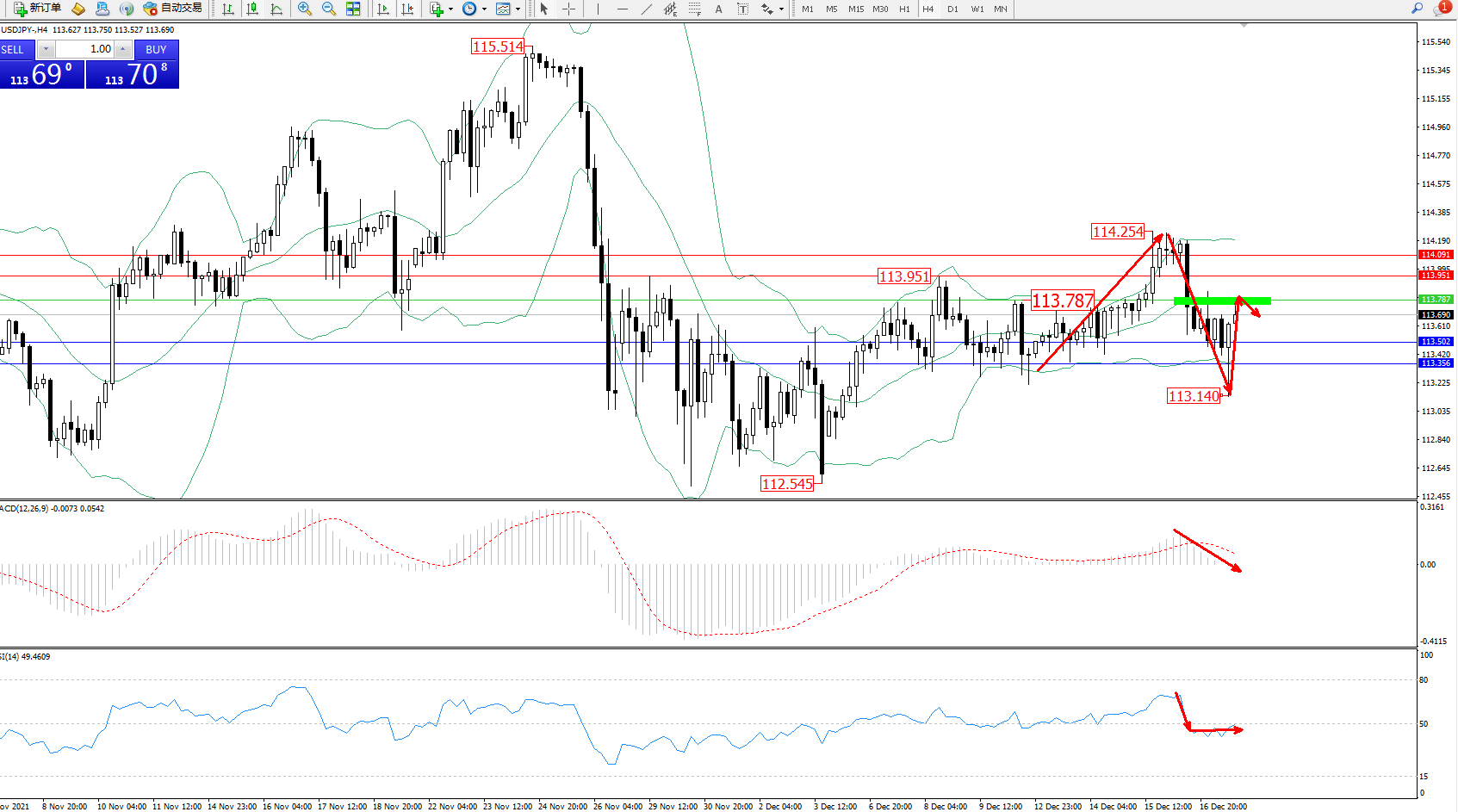 技术点评:多头动力延续布林带指标通道中上轨区间持续震荡上扬,高位抵达114.254位置后遇阻整理后急速回撤,跌破布林带指标下轨至113.140位置后得到支撑反转上移,即将触及布林带指标中轨附近节点,布林带指标呈收口走势持续平移,MACD指标处于多头区域震荡回撤至0轴线附近徘徊,RSI指标处于50均衡线下侧弱势整理中;
