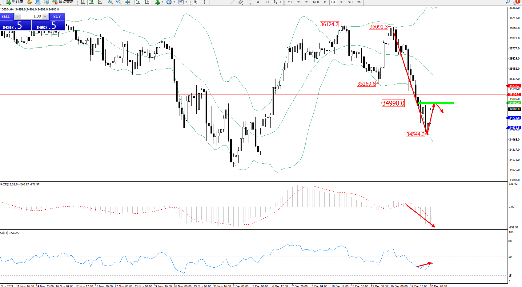 技术点评:空头动力延续布林带指标下轨附近急速震荡下行,低位抵达34544位置得到支撑后快速回升,但整体下行趋势态势良好,布林带指标呈张口走势良好,MACD指标处于空头区域维持整理平移,RSI指标处于空头区域持续震荡后有缓慢回升迹象;