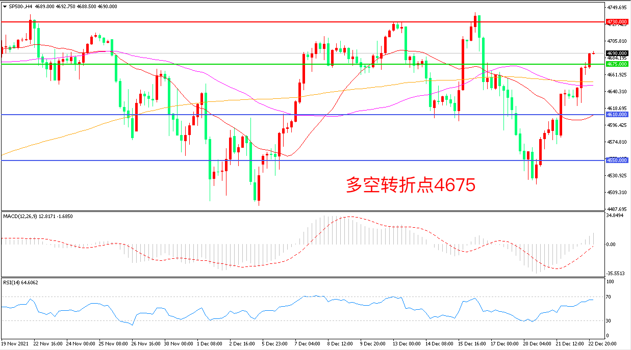4小时图看,标普500长阳拉升,短线走势有所回暖,均线系统粘合形成下方支撑,4675成为多空分水岭,MACD红烛增加,日内震荡上行概率较大。
