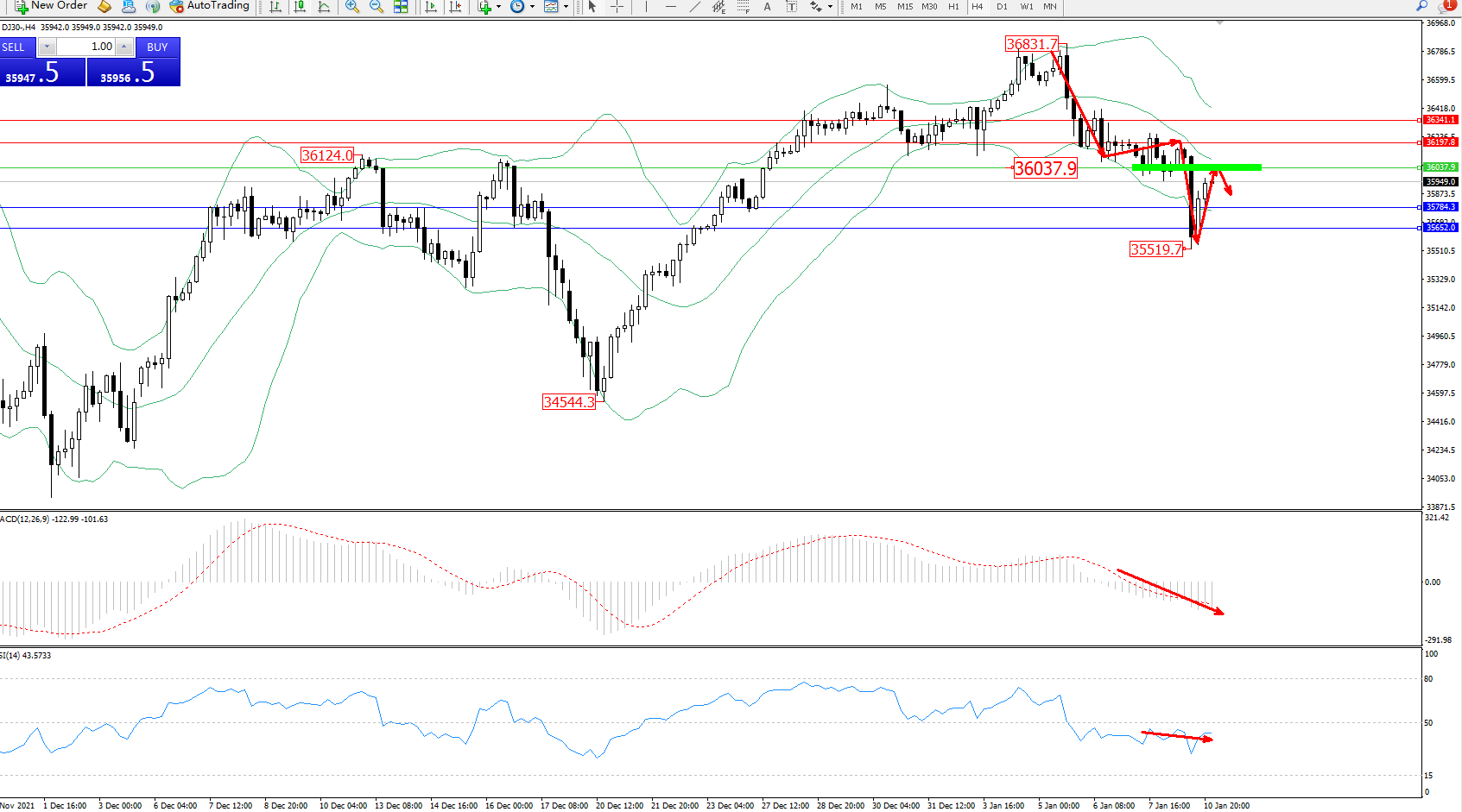 交易策略:36037下方看跌,目标35784、35652
