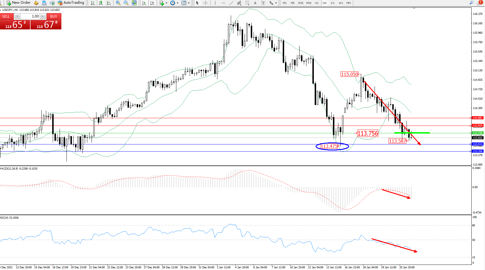 技术点评:空头动力延续布林带指标下轨附近持续震荡下行,低位抵达113.587位置后有继续下行态势,前期低位113.475位置近在咫尺,破位在即,布林带指标呈向下移动趋势态势良好,短期未见止步迹象,MACD指标处于空头区域维持整理缓慢下行,RSI指标处于空头区域弱势震荡向下移动中;