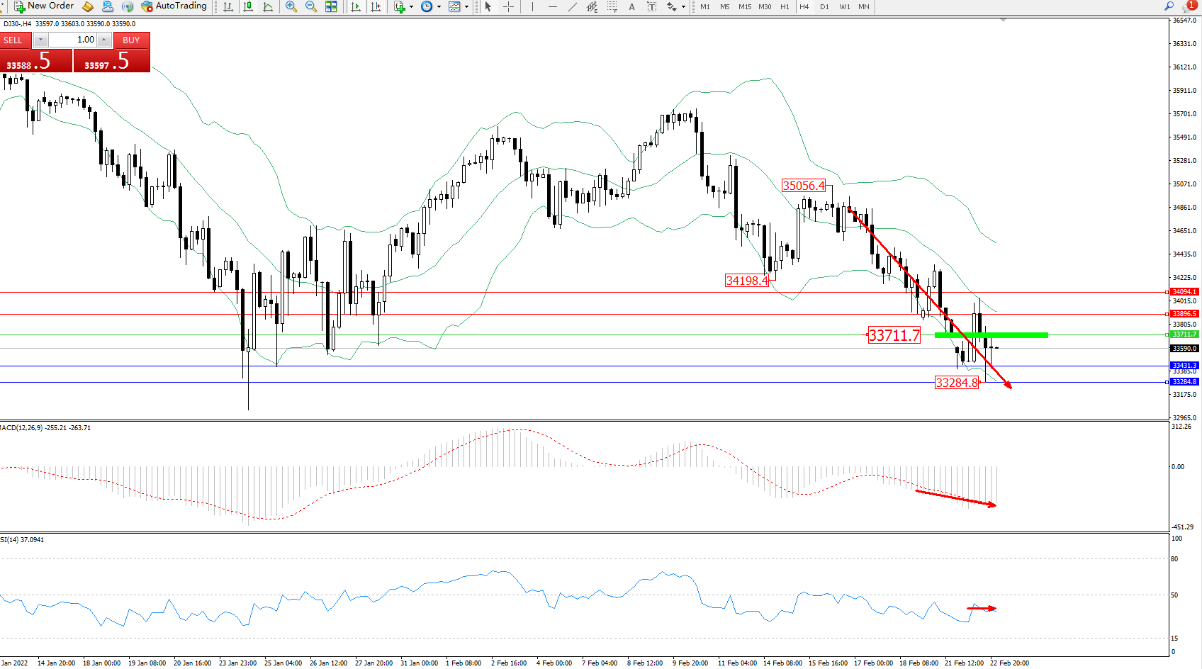 技术点评:空头动力延续布林带指标通道中下轨区间持续震荡下行,低位抵达33284位置节点后维持震荡,短期空头动力有继续向下移动态势,布林带指标呈向下移动趋势态势良好,MACD指标处于空头区域维持整理平移,RSI指标处于50均衡线下侧持续徘徊中;
