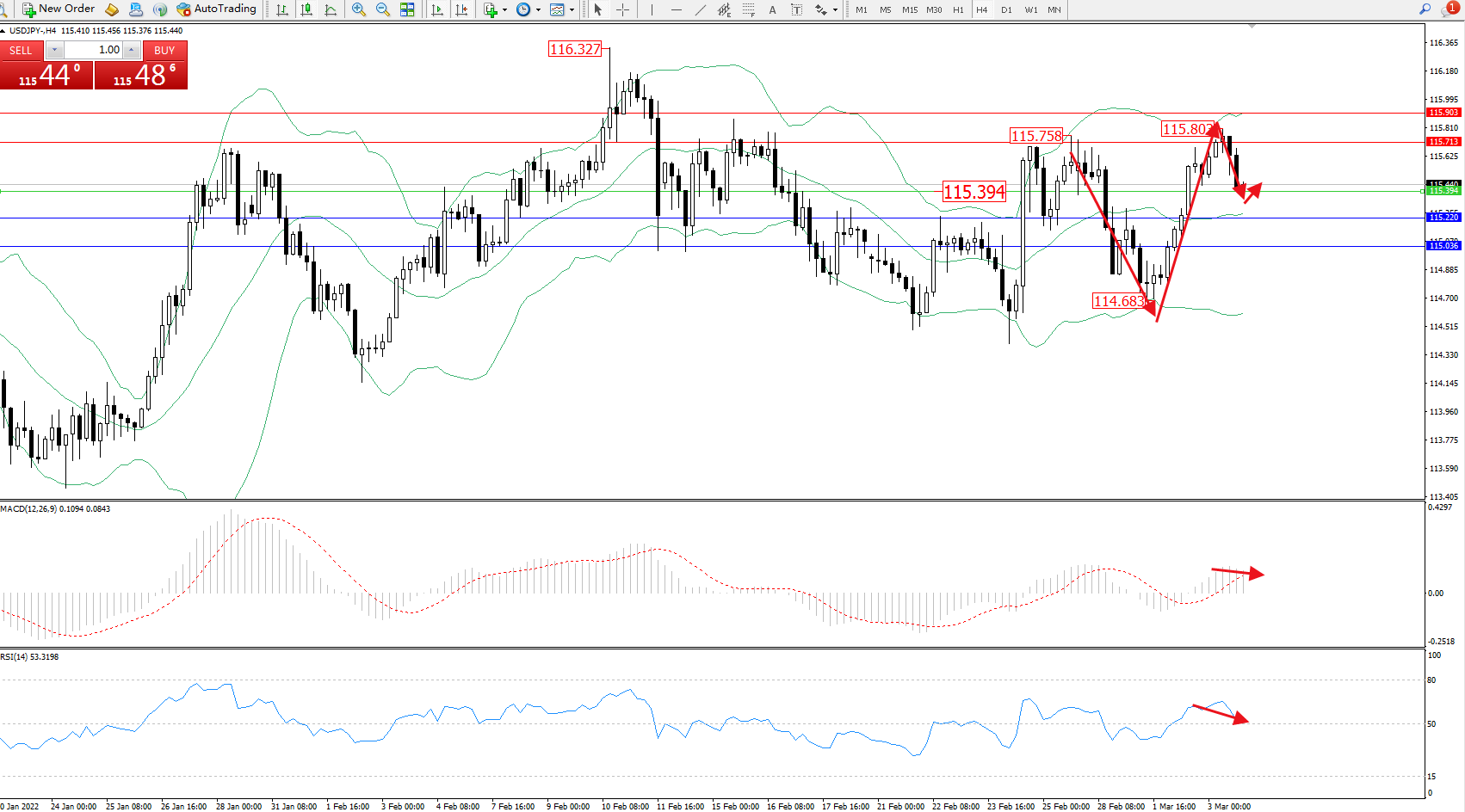 备选策略:115.394下方看跌,目标115.220、115.036