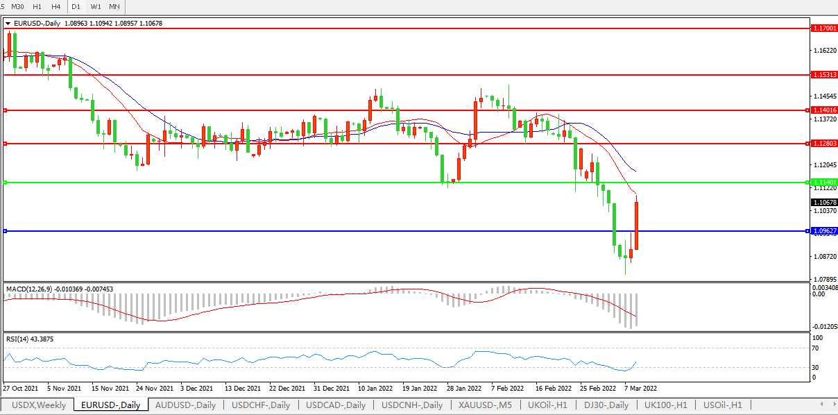 技术面简析:日图均线呈空头排列,汇价直线拉升,MACD运行于0轴下方但量能0轴下快速缩量,RSI快速反弹,预计短期汇价大概率将继续反弹。