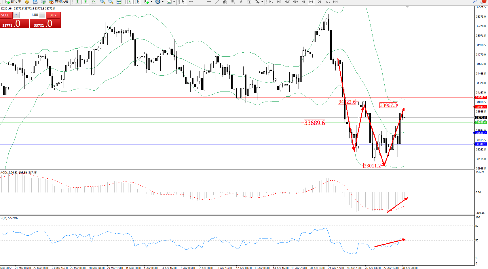 技术点评:空头动力延续布林带指标通道中下轨区间持续宽幅震荡下挫,低位抵达33011附近节点后开始反转拉升,高位抵达33967附近节点后震荡,短期多头动力有继续上移迹象,布林带指标呈收口走势持续平移,MACD指标处于空头区域维持震荡上移,RSI指标处于空头区域维持震荡上移至50均衡线附近徘徊中;