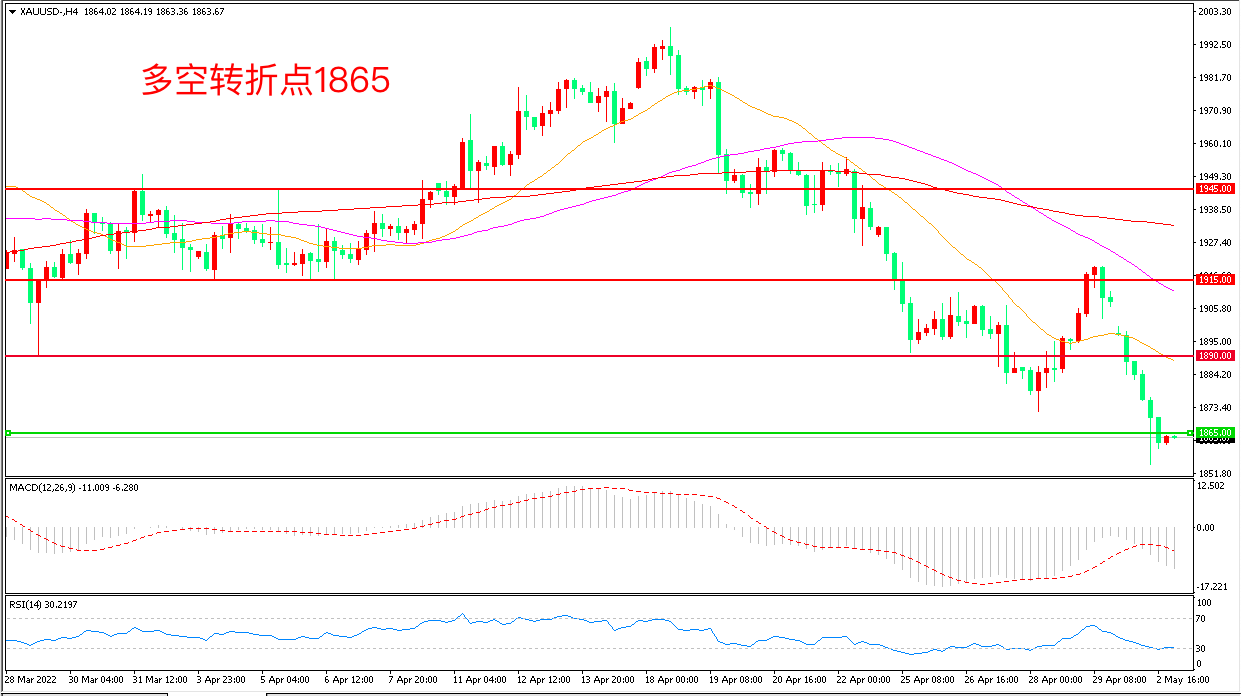 周一(5月2日),此前回落的美元指数反弹,又向二十年来高位靠近,美债收益率进一步上行施压金价,现货黄金大幅下挫,收报1863.82美元/盎司。目前投资者正等待美联储的议息会议结果,以获得有关货币紧缩步伐的更多信号,如果美联储加息幅度超过预期可能导致金价进一步下行。