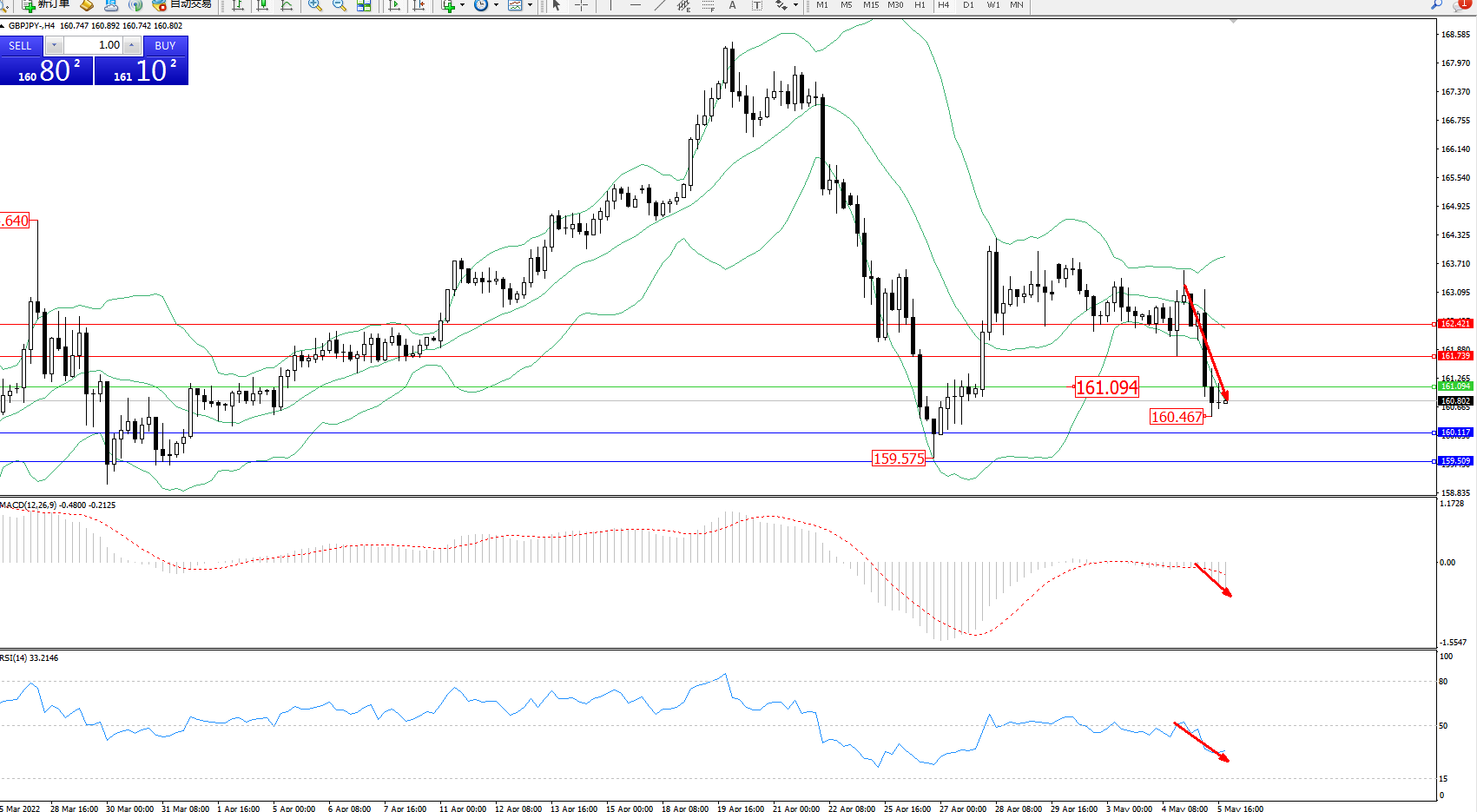 技术点评:空头动力延续布林带指标下轨附近持续震荡下挫,抵达160.467附近节点后整理,布林带指标呈张口走势持续中,前期低位159.575附近节点近在咫尺破位在即,MACD指标处于0轴线下侧弱势徘徊向下移动中,RSI指标处于50均衡线下侧维持震荡下行中;