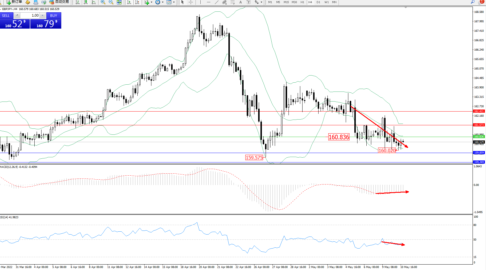 技术点评:空头动力延续布林带指标通道中下轨区间持续震荡下挫,低位波幅空间逐渐收窄,抵达160.020附近节点后开始整理,短期空头动力有继续维持低位徘徊迹象,布林带指标呈收口走势持续,MACD指标处于0轴线下方维持窄幅整理平移,RSI指标处于50均衡线下侧弱势徘徊中;