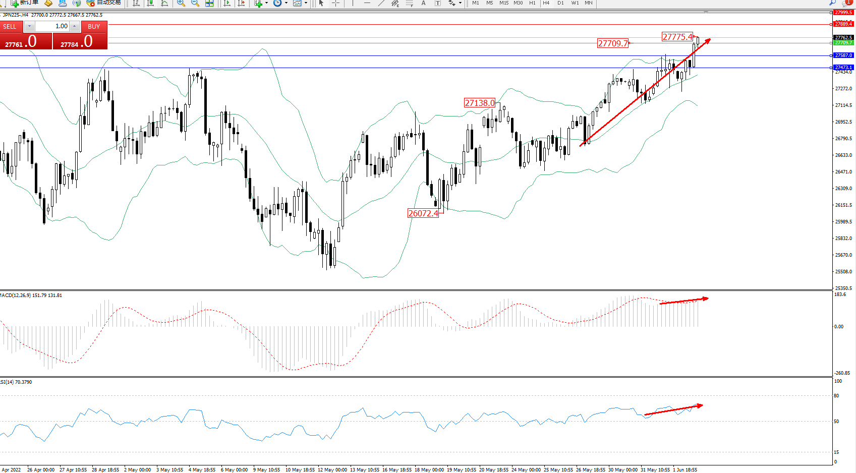 技术点评:多头动力延续布林带指标通道中上轨区间持续震荡上扬,高位抵达27775附近节点后整理,短期多头动力有缓慢震荡上移走势迹象,布林带指标呈上行趋势走势后,高位开始缓慢张口,MACD指标处于多头区域高位维持整理平移,RSI指标处于多头区域维持整理弱势上行;