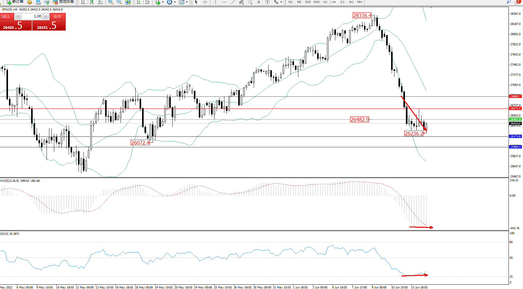 技术点评:空头动力延续布林带指标下轨附近持续下挫,低位抵达26236附近震荡中,布林带指标呈收口走势不断下行,MACD指标处于空头区域低位维持整理平移,RSI指标处于空头区域底部维持整理缓慢平移后有上移迹象;