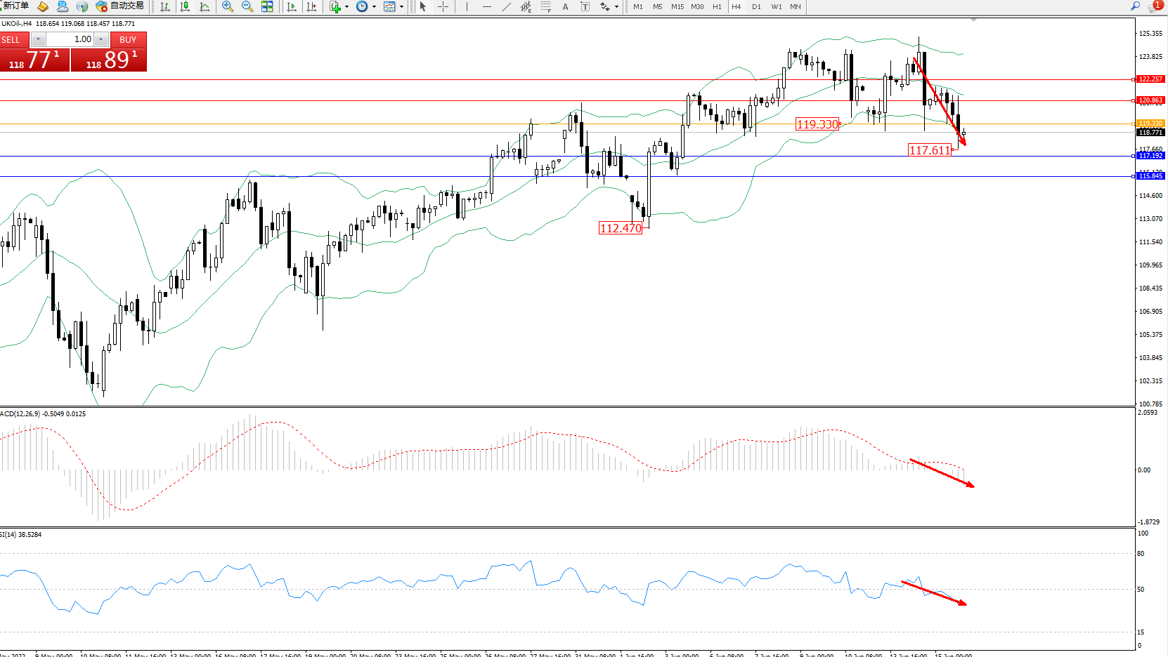 技术点评:空头动力延续布林带指标通道中下轨区间持续震荡下行,低位跌破下轨至117.611附近节点后震荡,布林带指标高位呈收口不断平缓向下移动,MACD指标处于0轴线下方空头区域不断下移,RSI指标处于50均衡线下侧弱势徘徊;