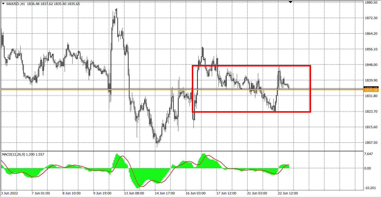 1小时图看,金价围绕1835来回拉锯,短期趋势再度进入新的整理区间,在1823-1848此箱体未突破前难以确认方向,操作上宜舍弃中间点位,等待箱体高低点出机会或突破后再顺势进场