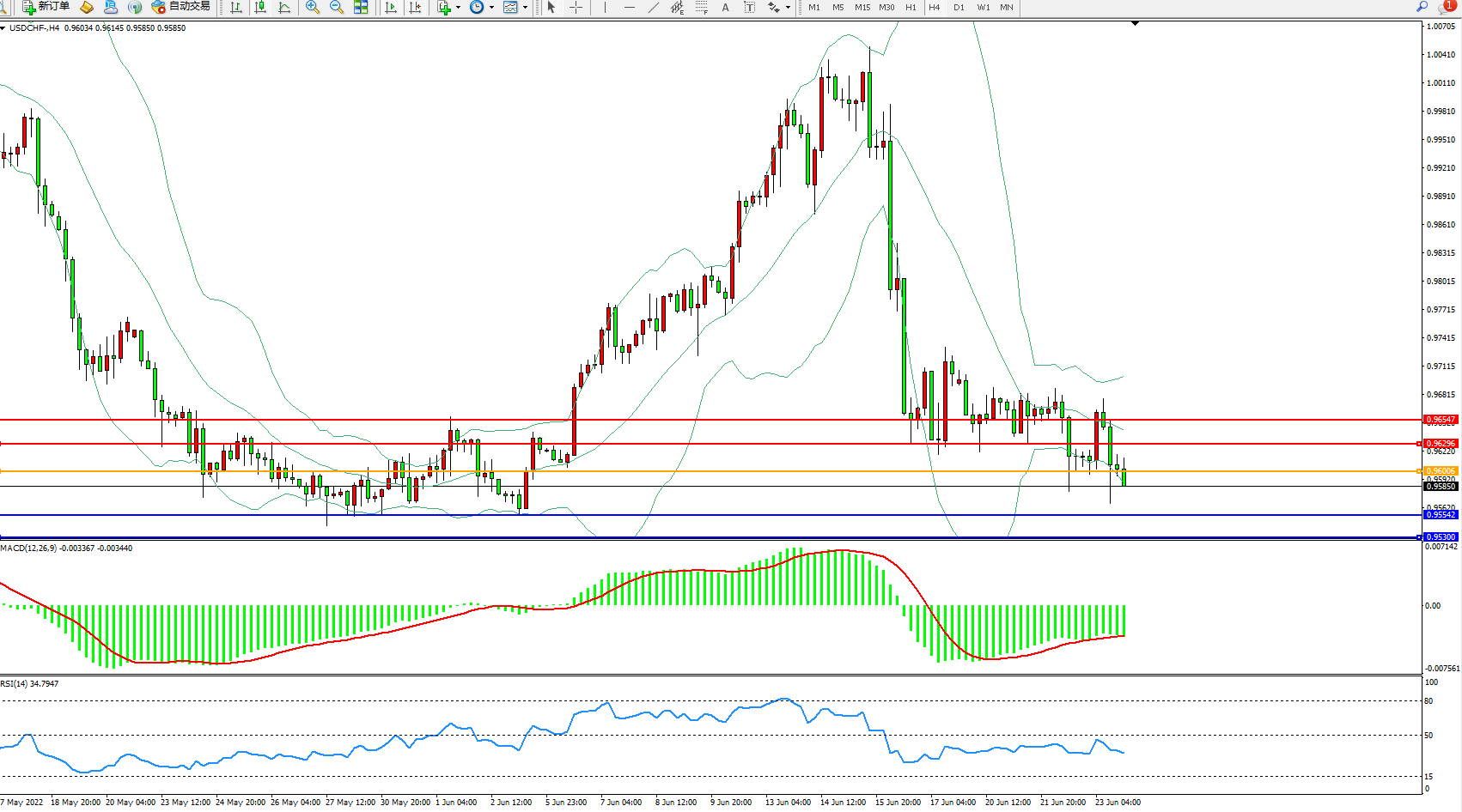 交易策略:0.96006下方看跌,目标0.95542、0.95300